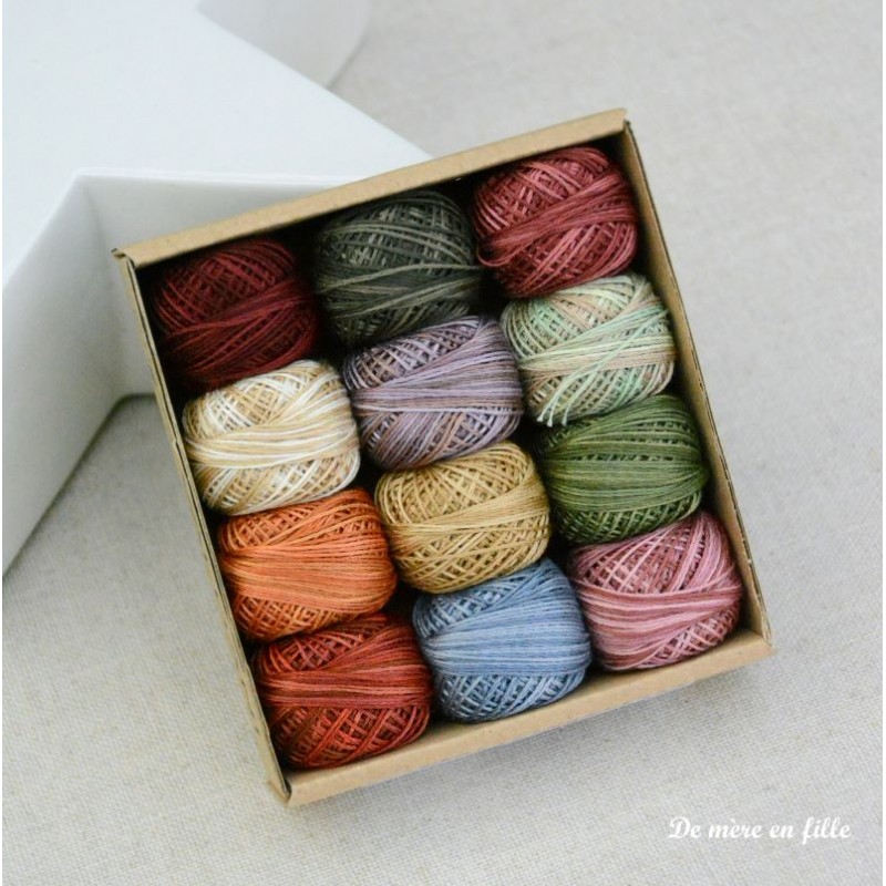 Coffret composé de 12 pelotes de fils moulinés Valdani 3 brins divisibles de 27 mètres