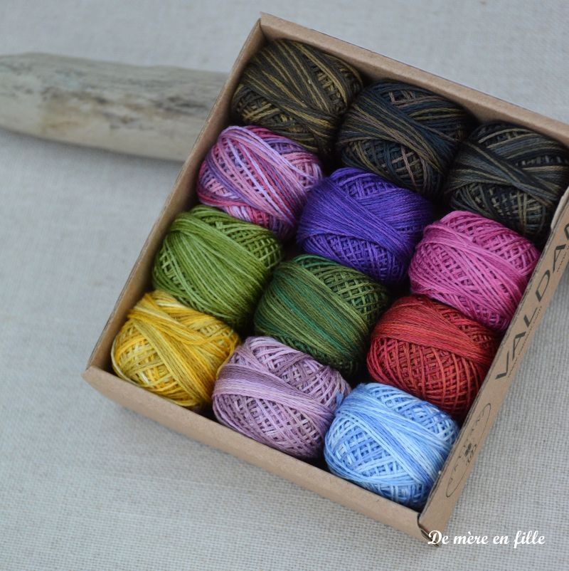 Coffret composé de 12 pelotes de fils moulinés Valdani 3 brins divisibles de 27 mètres