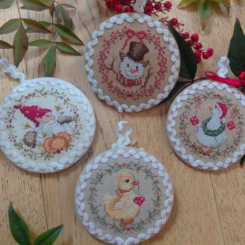 Cet ouvrage a été brodé sur une toile de lin Zweigart 12,6 fils dans divers coloris, 309 mocha, 99 écru, 3009 vintage country mocha